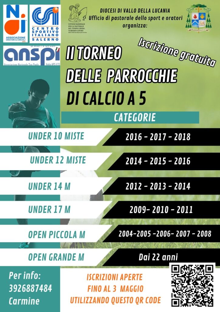 ​La Diocesi di Vallo della Lucania, attraverso l’Ufficio di pastorale dello sport e oratori, ha ufficialmente aperto le iscrizioni per il II Torneo delle Parrocchie di Calcio a 5. Un’iniziativa che unisce sport, comunità e divertimento, organizzata in collaborazione con NOI Associazione, CSI Salerno e ANSPI.