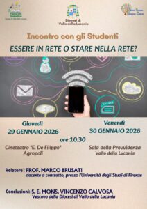 Su iniziativa dell’Ufficio di pastorale scolastica e l’Ufficio di Animazione Culturale, grazie alla disponibilità e la collaborazione dei dirigenti scolastici, il prof. Brusati incontrerà anche gli studenti delle scuole superiori di Agropoli e di Vallo della Lucania sul tema “Essere in rete o stare nella rete”, rispettivamente giovedì 29 gennaio alle ore 10.30 presso il CineTeatro “Eduardo De Filippo” e venerdì 30 gennaio alle ore 10.30 presso il CineTeatro “La Provvidenza” con la partecipazione anche del Vescovo Calvosa