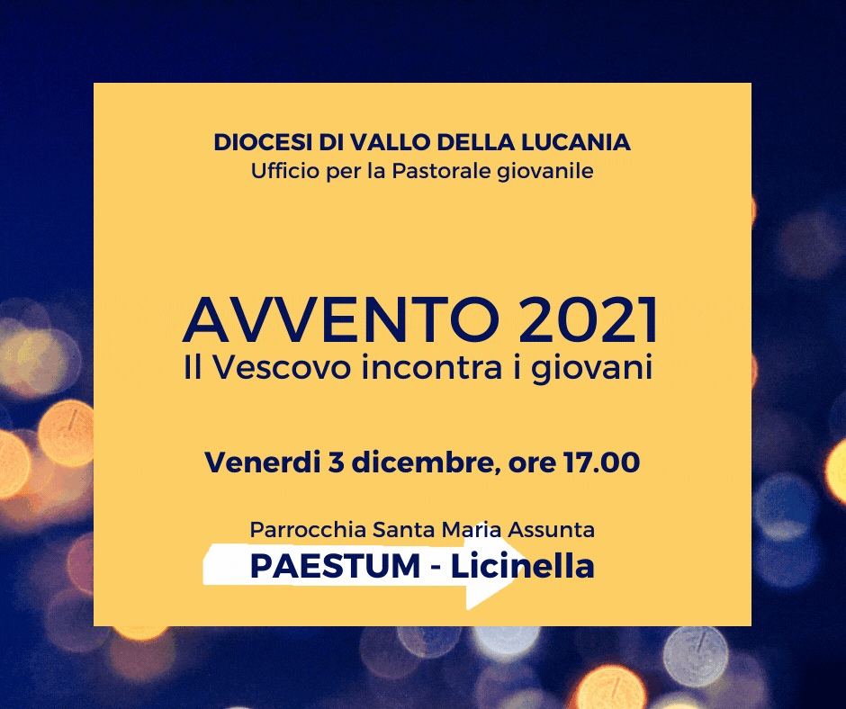 Per questo tempo di Avvento 2021 il Vescovo Mons. Miniero incontrerà i giovani delle comunità parrocchiali per un momento di preghiera e riflessione in preparazione al Santo Natale. L’appuntamento è Venerdì 3 dicembre p.v., ore 17.00, presso la Parrocchia “S.Maria Assunta” in Paestum (Loc. Licinella).