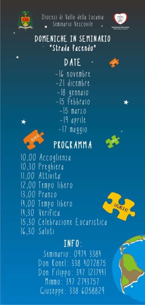 Da domenica 16 novembre, presso il Seminario di Vallo della Lucania, si terranno degli incontri vocazionali per coloro che avvertono il desiderio di seguire Gesù più da vicino. Sono invitati i ragazzi delle scuole medie e superiori.