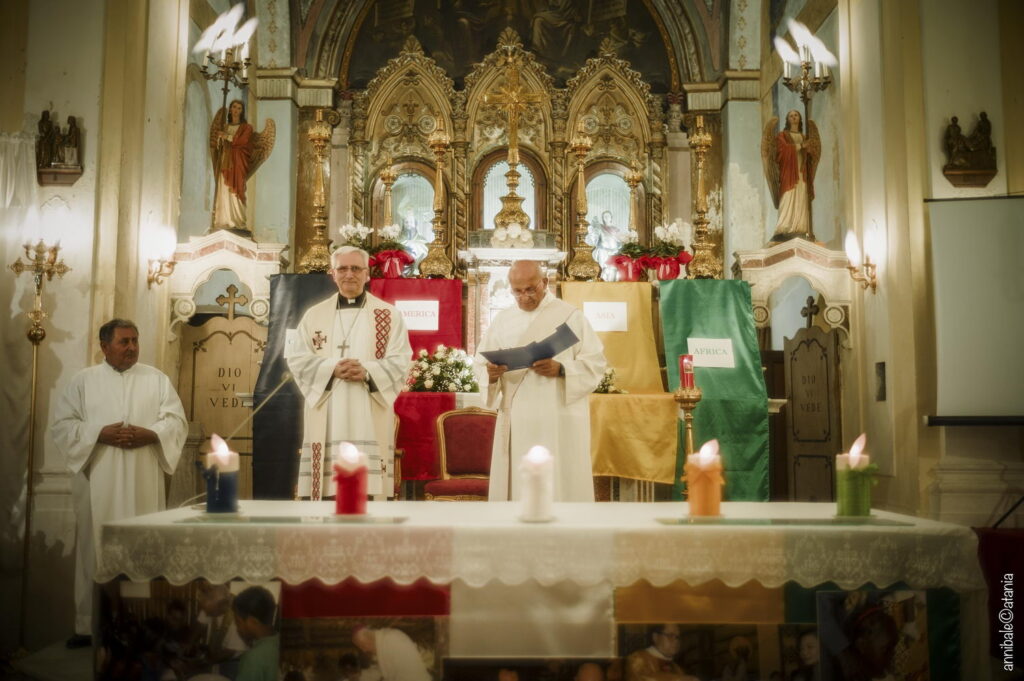 La chiesa è stata preparata in modo da mettere in evidenza l’altare con delle stoffe di 5 colori simboleggianti i Continenti (bianco – Europa, rosso – America, giallo – Asia, verde – Africa, blu – Oceania) e ceri degli stessi 5 colori.